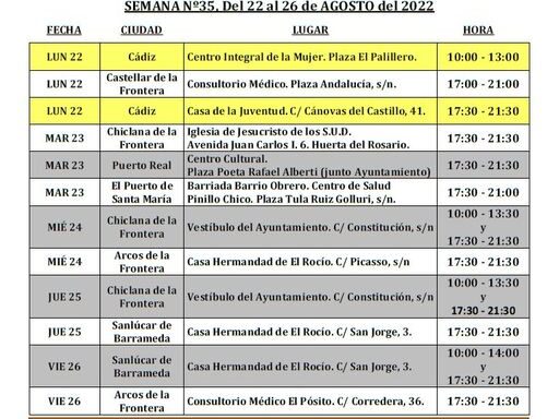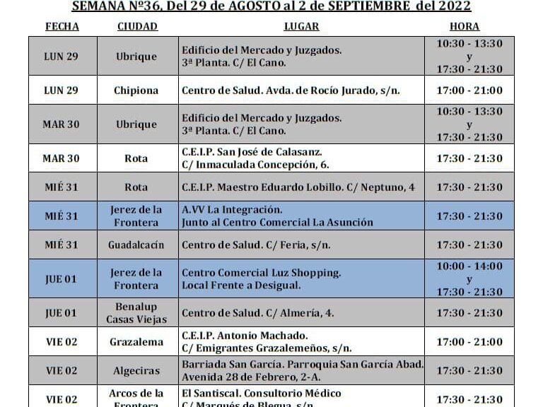 Programación semanal de colectas de sangre en la provincia de Cádiz.