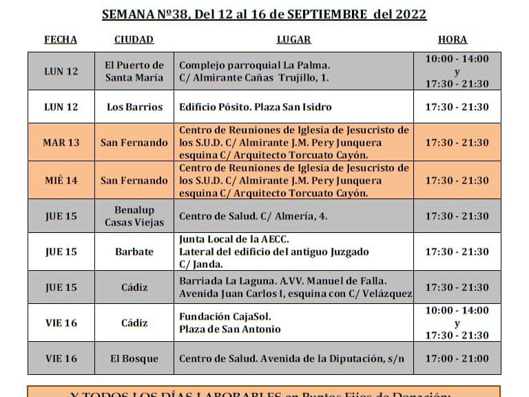Horario de donación de sangre para esta semana. Dona sangre, dona médula, regala vida.