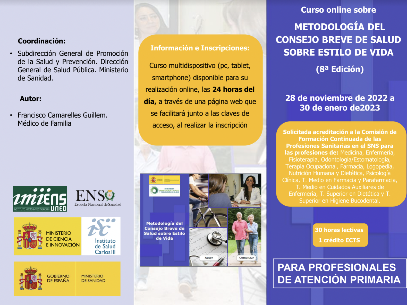 Curso online sobre METODOLOGÍA DEL CONSEJO BREVE DE SALUD SOBRE ESTILOS DE VIDA (8ª eDIC.) Se llevará a cabo entre el 28 de Noviembre 2022 al 30 de Enero de 2023 en el marco del Plan de Capacitación de la Estrategia de Promoción de la Salud y Prevención en el Sistema Nacional de Salud del…