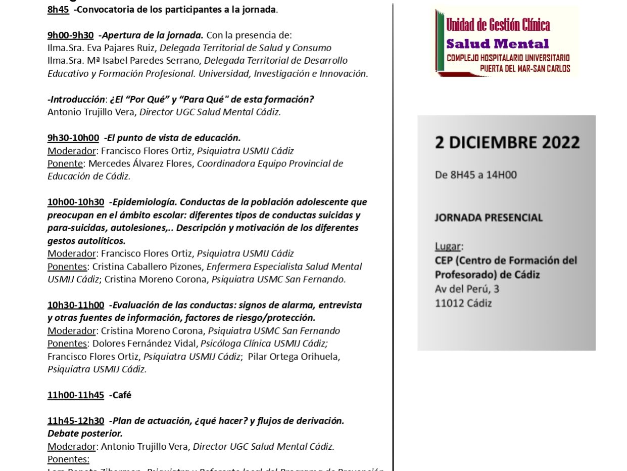 Jornada-Taller sobre prevención del suicidio en el medio académico (enseñanza secundaria) a realizar el próximo viernes día 2 de Diciembre en el Centro de Formación del Profesorado en la Avda. del Perú nº 3. Dirigida fundamentalmente a la formación de los orientadores escolares de los IES de Cádiz y San Fernando y a la enfermería…