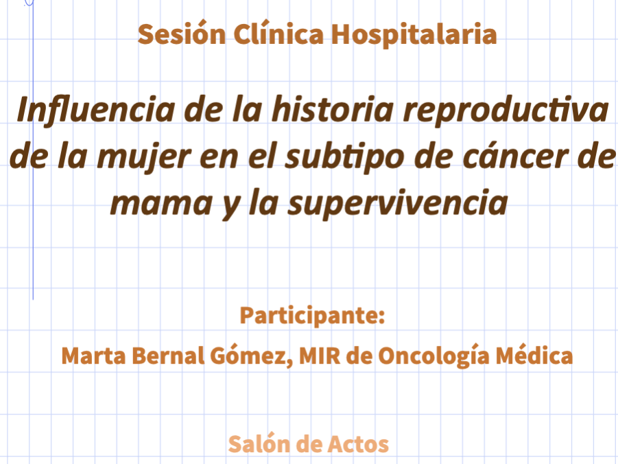 El próximo 24 de octubre, a las 8.15 horas, tendrá lugar una sesión clínica hospitalaria, impartida por Marta Bernal Gómez, MIR de Oncología Médica. Será en el Salón de Actos del Hospital