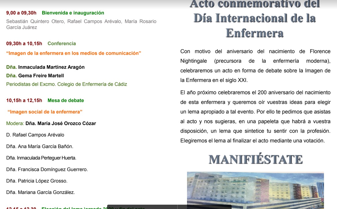 Este jueves, 16 de mayo, tendrá lugar en el Hospital Puerta del Mar un acto especial con motivo del Día Internacional de la Enfermería (12 de mayo). El acto consistirá en una conferencia sobre la imagen de la enfermera en los medios de comunicación, seguida de una mesa debate sobre la imagen social de la enfermera (cual es, sus causas, las repercusiones que pueda tener sobre el desarrollo profesional y cómo podemos contribuir a modificarla). Simultáneamente, se solicitará a los asistentes que aporten un lema para la celebración, el año próximo, del 200 aniversario del nacimiento de Florence Nightingale y se elegirá uno por votación.