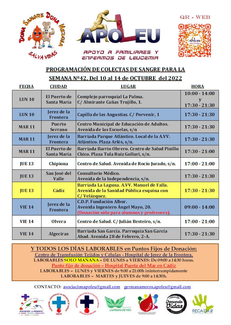 Calendario de colectas de sangre del 10 al 14 de octubre de 2022