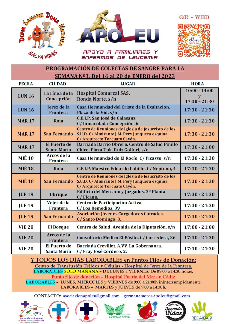 Programación de colectas de sangre del 16 al 20 de enero de 2023